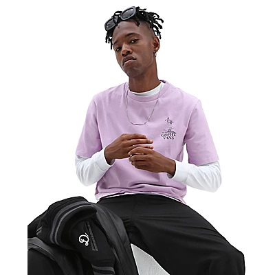 Le t-shirt Vault by Vans x Goodfight s’inspire des motifs horticoles de la collection. Des fleurs d’orchidées dessinées à la main ornent le logo conjuguant les deux marques, tandis que l’illustration au dos évoque une serre d’école. Le lévrier figurant au premier plan est « Isabel », la chienne de deux des fondateurs de Goodfight et l’animal de compagnie atittré de leur studio de Los Angeles. Pour Goodfight, l’orchidée est un rappel essentiel de deux de nos principes fondateurs : d’une part, que nous sommes tous uniques, singuliers et étranges, et d’autre part, que notre beauté individuelle n’est pas destinée à nous diviser, mais à nous rapprocher de notre véritable source de pouvoir : ce qui nous lie les uns aux autres.