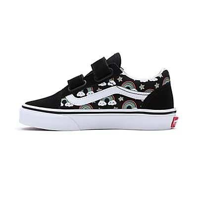 Les Old Skool pour enfant revisitent nos emblématiques chaussures à Sidestripe en remplaçant les lacets traditionnels par une double fermeture à scratch. Un imprimé arc-en-ciel vibrant ressort sur la tige noire de ces chaussures basses qui gardent leur allure classique tout en offrant un ajustement sûr, facile et confortable toute la journée.