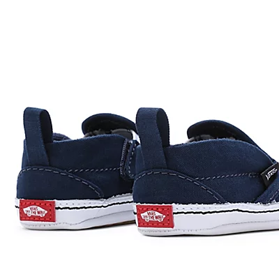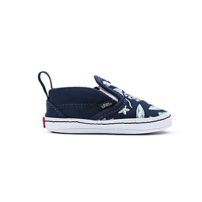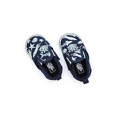 Les chaussures à scratch Slip-On Crib de Vans sont dotées d’une tige en daim et en toile, de côtés élastiques et d’une languette au talon pour un chaussage facile. Elles sont imprimées de motifs sur le thème de l’océan.