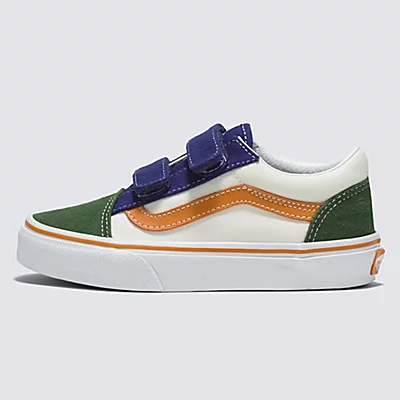 Les Old Skool V Twill Block pour enfant revisitent nos emblématiques chaussures à Sidestripe en remplaçant les lacets traditionnels par une double fermeture à scratch. Ces chaussures basses présentent une tige color-block rétro pour un look emblématique et un maintien facile, sûr et confortable toute la journée.