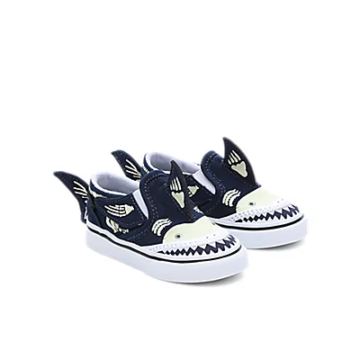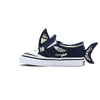Plonge dans les profondeurs de l’océan avec les Slip-On V Shark Glow pour bébé. Ces drôles de chaussures sans lacets évoquent un requin avec leurs ailerons souples et un bout en caoutchouc aux dents redoutables. Avec leur squelette phosphorescent, elles donnent vie jour et nuit à cette espèce marine.