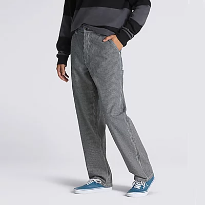 Le pantalon Drill Chore Loose Tapered Carpenter Hickory Stripe est rĂ©alisĂ© en denim Ă rayures en fil teint et reprend des finitions utilitaires classiques, dont une boucle pour marteau sur la poche arriĂšre gauche et une poche Ă outils sous la poche droite. De plus, de nouveaux dĂ©tails apportent beaucoup de style Off-The-Wall Ă ce pantalon de menuisier classique, y compris le nouveau passant de ceinture en V au dos et la nouvelle Ă©tiquette drapeau prise dans la couture intĂ©rieure de l’ourlet visible lorsqu’il est retroussĂ©.