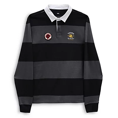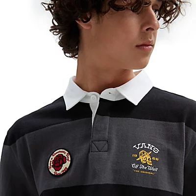 Le polo Ă©pais Desert Hi Rugby s’inspire des maillots de rugby avec ses manches longues et ses rayures remarquables qui structurent la silhouette. Il prĂ©sente un col en sergĂ© contrastant, des broderies sur la poitrine et d’une Ă©tiquette Vans Ă l’ourlet.