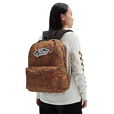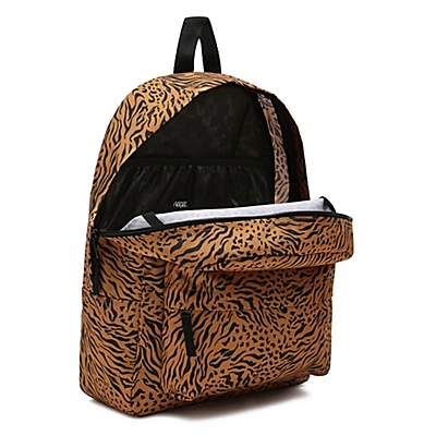 Le sac à dos Realm présente deux compartiments, dont un principal à fermeture zippée. Il dispose aussi d’une poche intérieure pour ordinateur portable, d’une poche organisée sur le devant, de bretelles rembourrées réglables pour le confort et d’une doublure du dos gaufrée. Ce modèle est entièrement imprimé d’un motif animalier et orné d’un logo Vans sur le devant.
