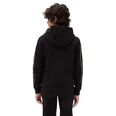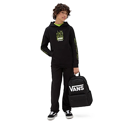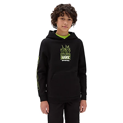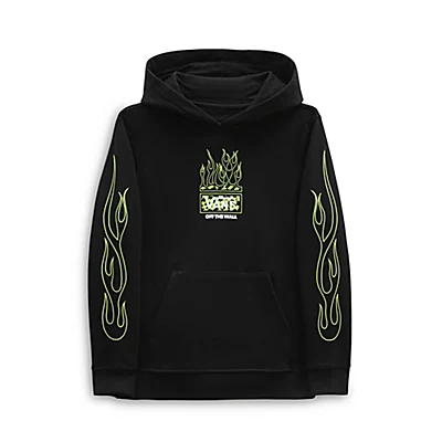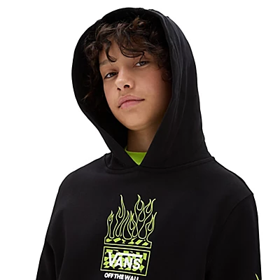 Le sweat à capuche Neon Flames pour garçon présente des manches longues, une poche kangourou et un logo Vans orné de flammes sur la poitrine et les manches.