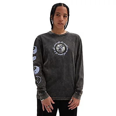 Le t-shirt à manches longues Bliss 66 Boyfriend Fit de Vans présente un col ras du cou et un logo Vans avec des motifs pacifistes sur le devant et au dos. Il arbore également le symbole yin-yang sur la manche droite.