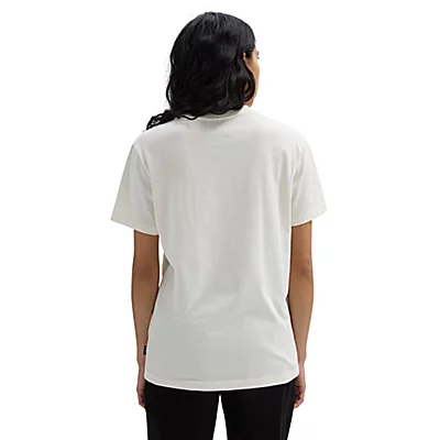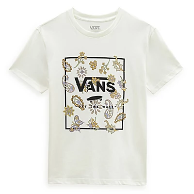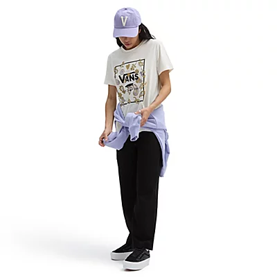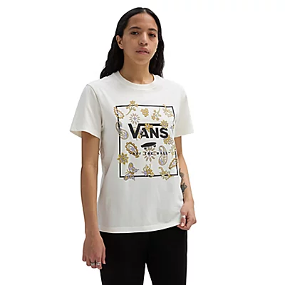 Le t-shirt Boyfriend Trippy Floral de Vans présente un col ras du cou, des manches courtes et un logo Vans avec des motifs floraux et papillons sur le devant.
