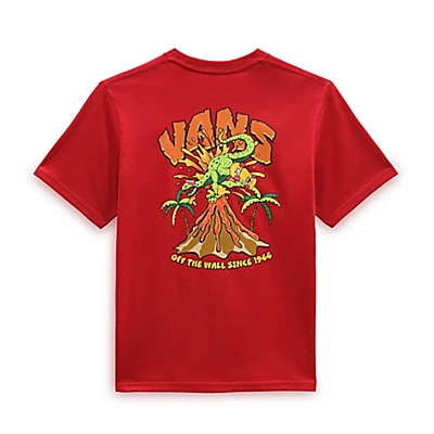 Le t-shirt Dino Egg Plant pour garçon de Vans présente un col ras du cou, des manches courtes et un logo Vans avec un motif dinosaure sur le côté gauche de la poitrine et au dos.