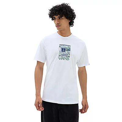 Le t-shirt Throwback Peace Machine de Vans présente un col ras du cou, des manches courtes et un logo Vans avec des motifs sur le thème de la paix sur le devant. Il présente une coupe classique.